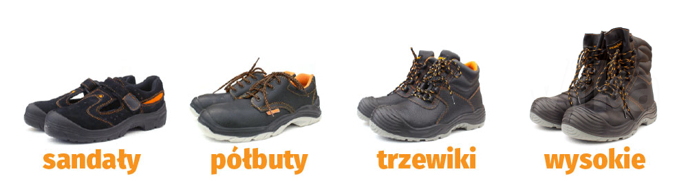 Najbardziej podstawowym podziałem obuwia ochronnego jest podział ze względu na jego konstrukcję, a ściślej wysokość cholewki. Wyróżniamy: półbuty (nie zakrywają kostki), do których zaliczamy również sandały, trzewiki (cholewka zakrywa kostki) oraz buty wysokie, do których zaliczamy buty z wysoką cholewką, buty do kolan oraz buty z przedłużona cholewką nad kolana. Poniżej przedstawiamy grafikę z podziałem obuwia ochronnego.