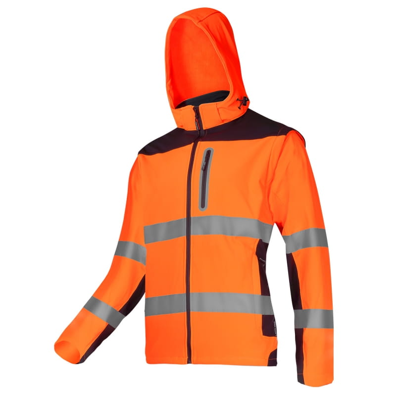 Kurtka softshell ostrzegawcza model L40922 wykonana ze stuprocentowego poliestru o gramaturze 320g/m2. Specjalna trój warstwowa tkanina z membraną TPU o wodoodporności 8000mm. Oddychalność na poziomie 3000g/m2/24h gwarantuje bardzo wysoki komfort użytkowania.Pasy odblaskowe wykonano zgodnie z normą EN ISO 20471. Kurtka ma trzy kieszenie, wiatroszczelne suwaki oraz odpinany kaptur z regulacją szerokości. Odpinane rękawy które robią z kurtki kamizelkę. Dodatkowa osłona suwaka pod szyją sprawia że ten nie przeszkadza i nie drapie podczas użytkowania. Rękawy zakończone ściągaczem z regulacją na rzep. Szerokość kurtki regulowana za pomocą specjalnego ściągacza. Odzież posiada certyfikat na zgodność z najnowszą normą ostrzegawczą EN ISO 20471 wydany przez Centralny Instytut Ochrony Pracy (CIOP) deklarację CE i spełniają postanowienia normy EN ISO 13688. Jest w drugiej kategorii środków ochrony indywidualnej.