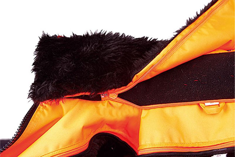 - wysoki futrzany kołnierz z chowanym kapturem,