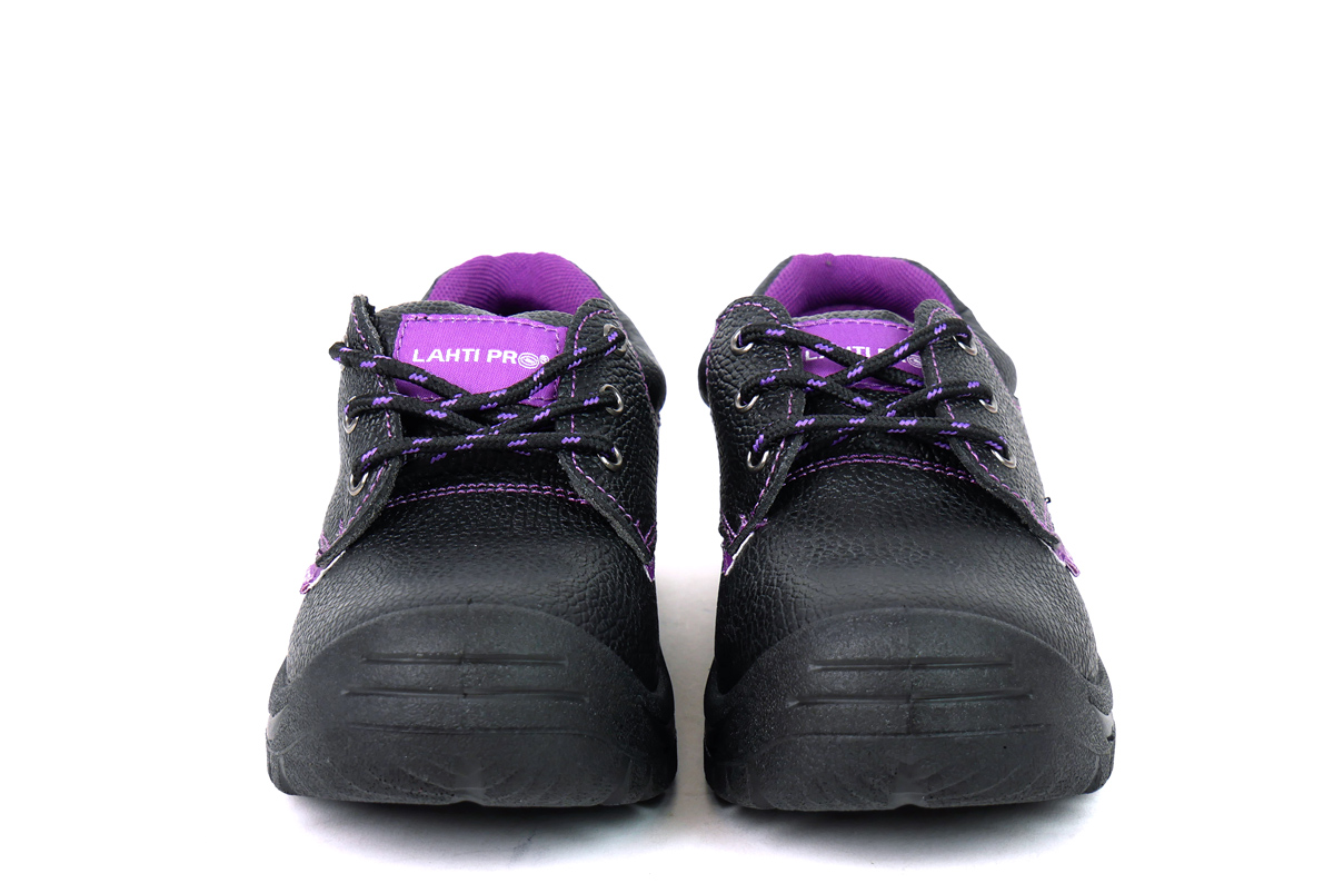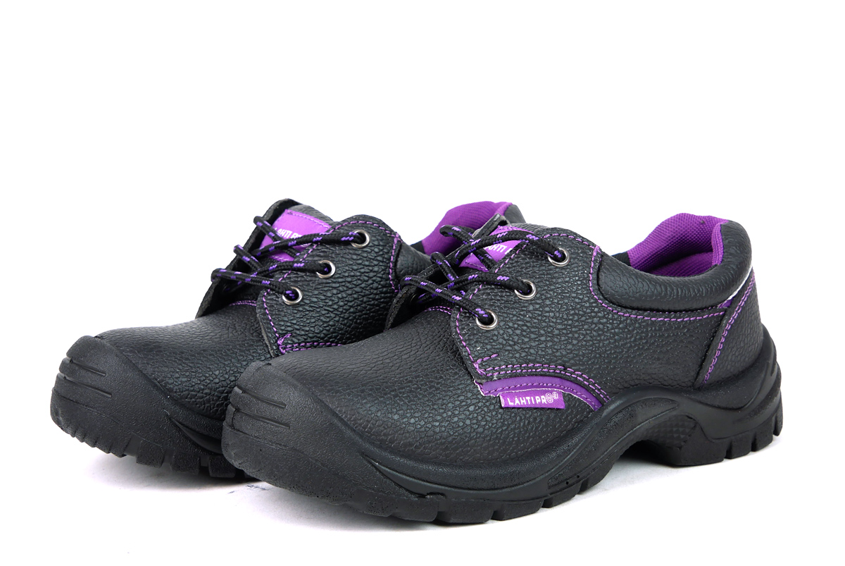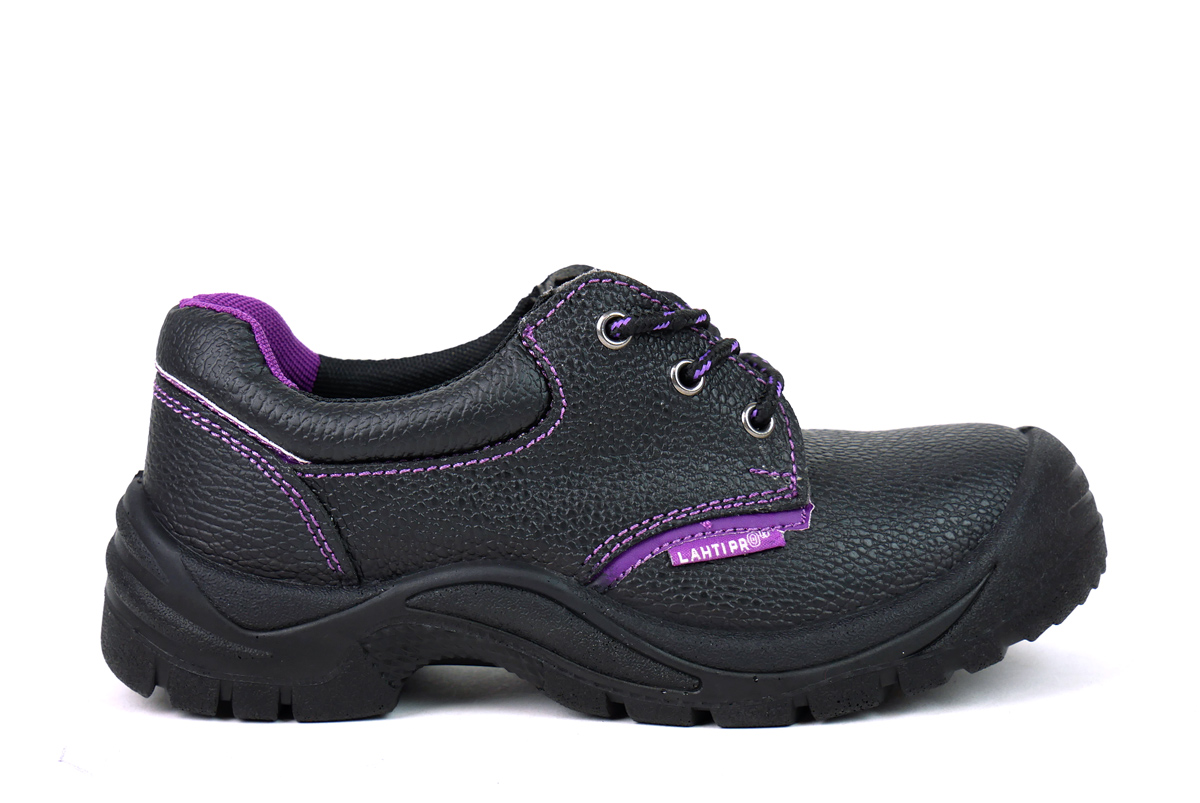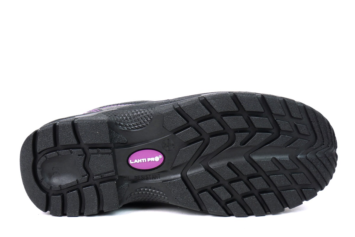 Obuwie robocze damskie Lahti Pro L30413 zostało wykonane ze skóry, dzięki temu obuwie jest solidne, trwałe, a także wodoodporne. W obuwiu zastosowano podszewkę z dzianiny siateczkowej o czarno – fioletowym kolorze, która zapewnia komfort podczas ich użytkowania, a także  w wymienną wkładkę, którą można w łatwy sposób wymienić. Ponadto podeszwa obuwia wykonana została z poliuretanu dwugęstościowego, oznacza to, że jest ona odporna na poślizg na różnych powierzchniach.