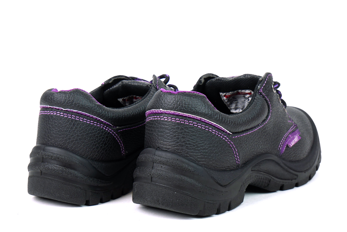 Buty zawodowe damskie Lahti Pro L30413 wykonane są ze skóry z połączeniem fioletowych wstawek i przeszyć. Dzięki zastosowaniu skóry, obuwie jest wytrzymałe, solidne i trwałe oraz wodoodporne.