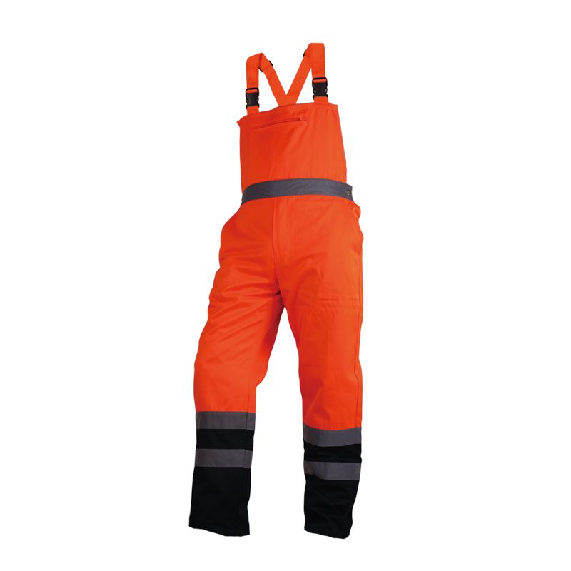Spodnie robocze ogrodniczki są wyposażone w elementy odblaskowe, co zwiększa widoczność użytkownika, szczególnie w warunkach słabego oświetlenia. Regulowany guzikami pas oraz elastyczne szelki zapewniają optymalne dopasowanie do ciała, co zapewnia wygodę podczas pracy. Kieszeń na piersi i skośne kieszenie umieszczone na bokach spodni zapewniają wygodne miejsce do przechowywania narzędzi lub innych potrzebnych rzeczy.