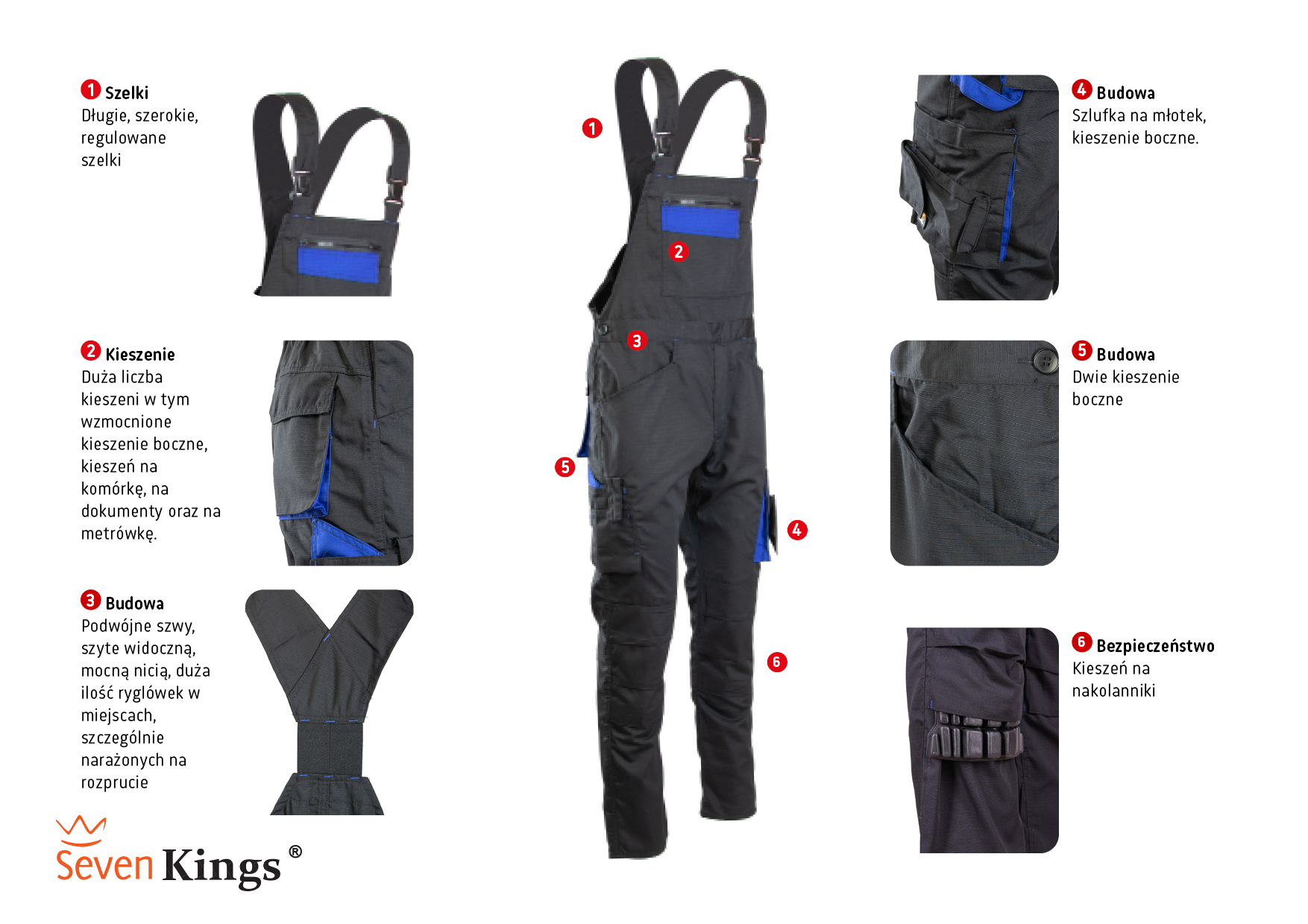 Spodnie robocze ogrodniczki Seven Kings to wygodne i praktyczne ubranie ochronne dla pracowników zajmujących się ogrodnictwem, budownictwem, czy remontami. Wykonane z trwałego i odpornego na uszkodzenia materiału, zapewniają wygodę i swobodę ruchów podczas pracy. Posiadają wiele kieszeni, co ułatwia przechowywanie narzędzi i drobnych akcesoriów.