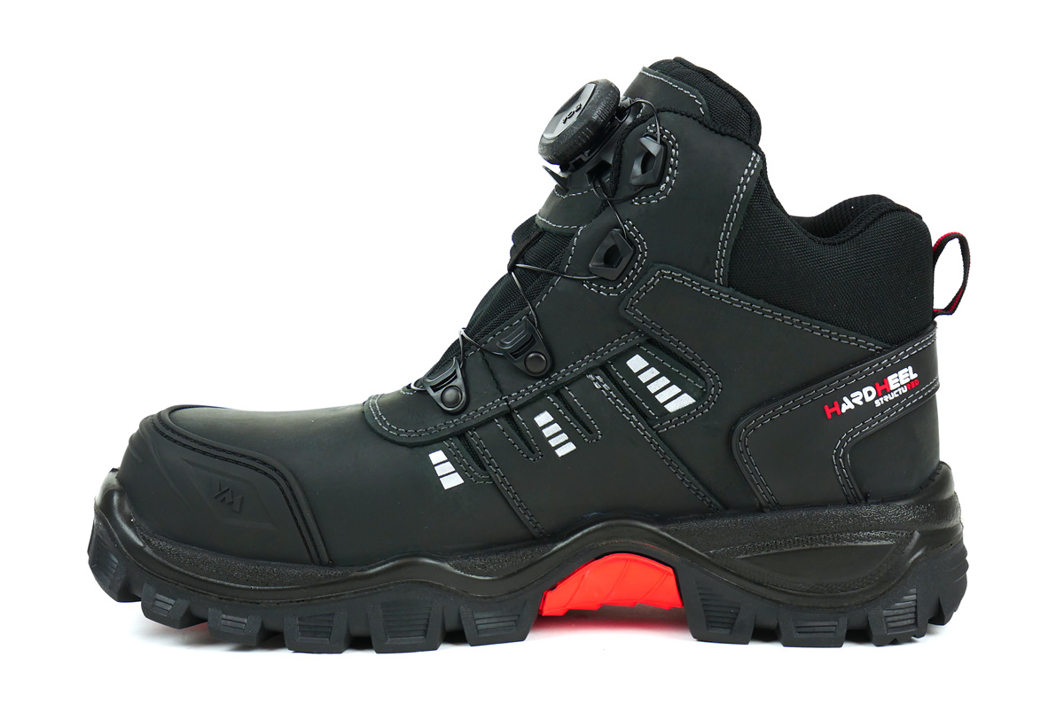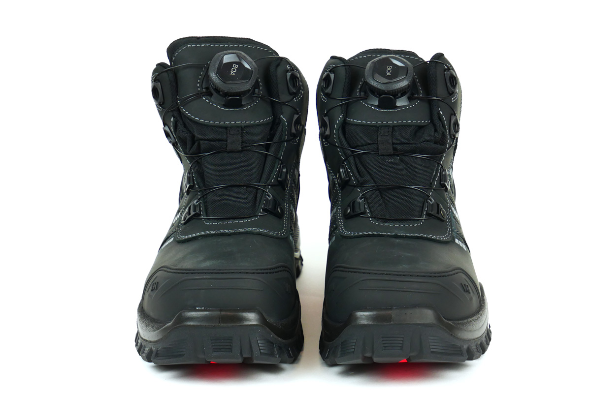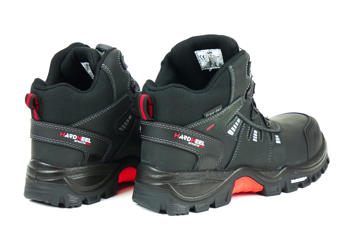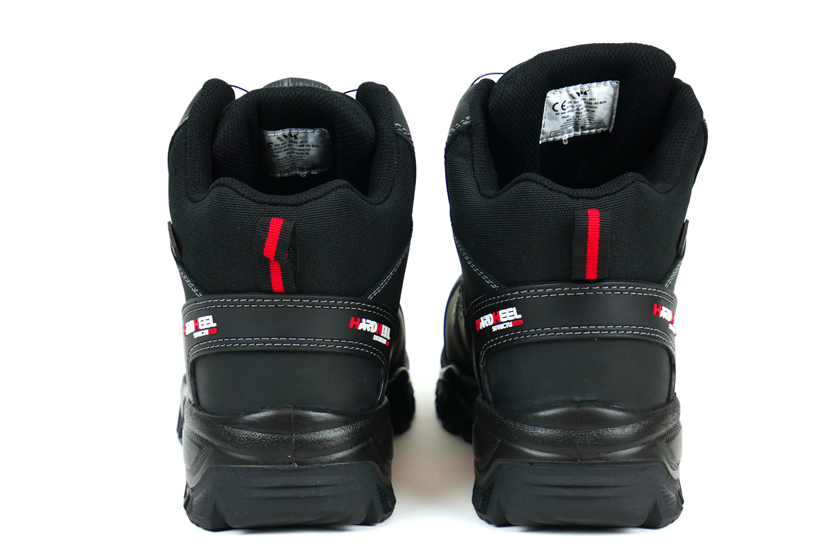 Na pierwszy rzut oka buty w ogóle nie przypominają butów roboczych. Moim zdaniem jest idealne połączenie kolorystyczne dominujący czarny z czerwonymi wstawkami przeszyte biała nicią. Wykonane ze skróty typu Nubuk z gumowymi dodatkami na palcach i pięcie, które przeszyte są białą, podwójną nicią oraz wstawkami usztywniającymi buty. W dotyku każdy element jest bardzo solidny i miły. Podeszwa bardziej przypomina podeszwę z butów trekingowych niż roboczych. Wykonane jest z miękkiej gumy w dotyku i ma bardzo ciekawy wzór.